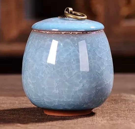 Kleine Urn van gebarsten keramiek als gedenkteken voor je huisdier. Je kunt er niet alleen wat as in bewaren maar bijvoorbeeld ook tandjes of haartjes van je geliefde huisdier.